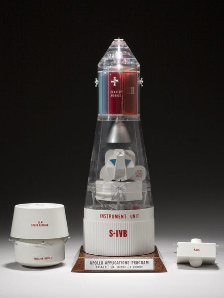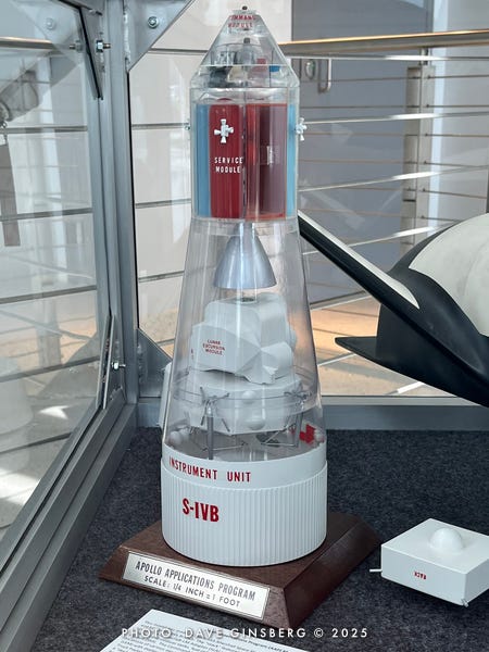 It is actually a set of models displaying concepts proposed for the follow-on Apollo Applications Program (AAP). Readers of Creating Space likely are familiar with Skylab, which was the only flown manifestation of the AAP. This model shows several other ideas for using hardware from the Apollo lunar landing program to extend NASA’s capabilities and perform additional scientific research in space.