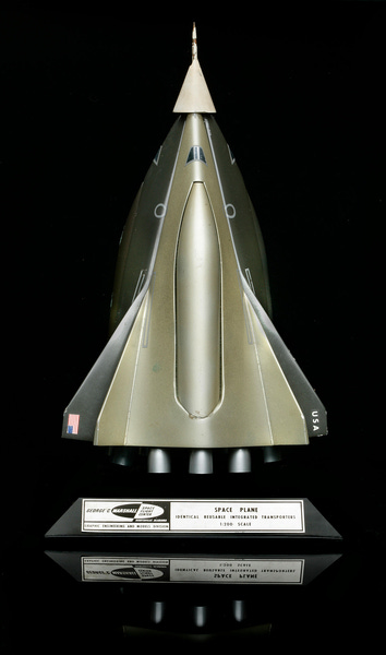 The contractor models are worth a closer look. In one corner is a Marshall Space Flight Center model of a Space Plane cluster consisting of three identical reusable integrated transporters, as defined on the base’s nameplate. This one sold at auction in 2012 for a small number ... followed by a handful of zeros.