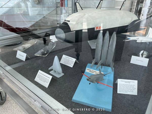 If you are a fan of early Space Shuttle concepts, as I am, a notable space plane model in this case will be of interest. The gray model on the blue base is a proposed Trimese concept for a Space Shuttle by General Dynamics and Convair. Originating in 1967, this three-part vehicle combination would boost the central piloted orbiter into Earth orbit. The outer two boosters, also piloted, would separate and extend their swing-wings and be flown back using deployable air-breathing turbofan engines to simultaneous runway landings.