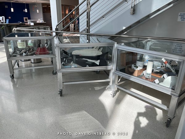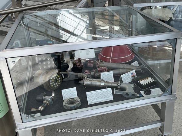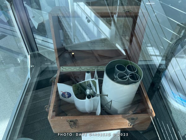 In addition to the full-scale MK1 mockup and other items in the lobby, there were three unassuming, yet very interesting, climate-monitored display cases tucked under the stairwell behind the MK1 mockup. The average visitor to the Blue Origin factory might easily miss them. I almost overlooked them, myself.