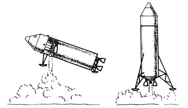What is perhaps less well known is that NASA had considered landing the vehicle on its side, rather than tail-first. This image shows what a sideways landing might look like, compared with a tail-first landing.3