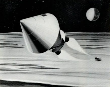 How then, you may ask, did they intend to ascend off of the Moon when it was time to return home? This illustration by Roy Scarfo, part of a series of illustrations created in 1962 for the New York Times Magazine, shows the return capsule launching almost horizontally from the main landing section.