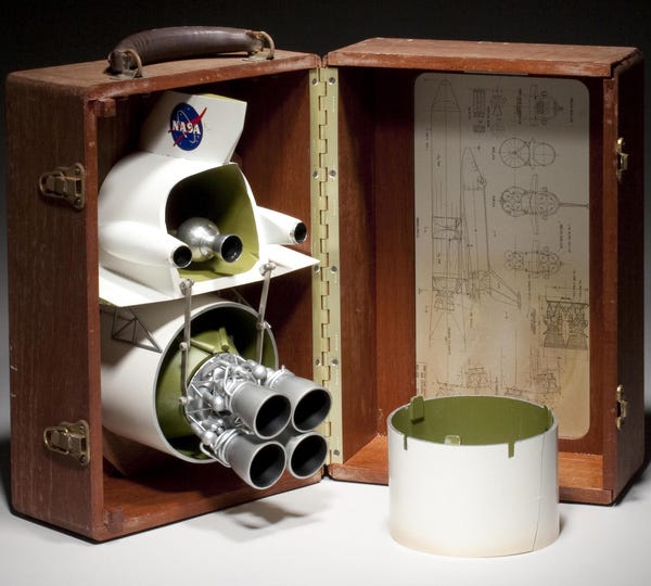 Here is a clearer photo of the model. According to the auction description, it is an early proposal by Maxime Faget for reusing the Space Shuttle booster engines. In this case, the four main booster engines would be positioned, at launch, aft of the external fuel and oxidizer tanks.