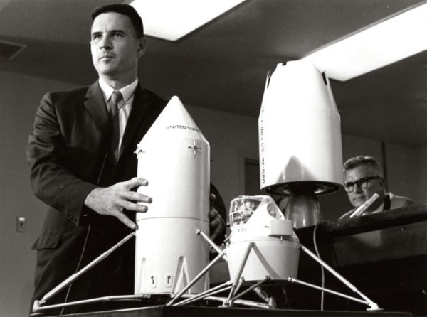 All these stages added up to a very tall – and very massive – structure. You can see in this photograph of the model NASA’s Joe Shea is holding during a 1962 news conference that they recognized the need for a very wide landing footprint – and thus very heavy landing gear.