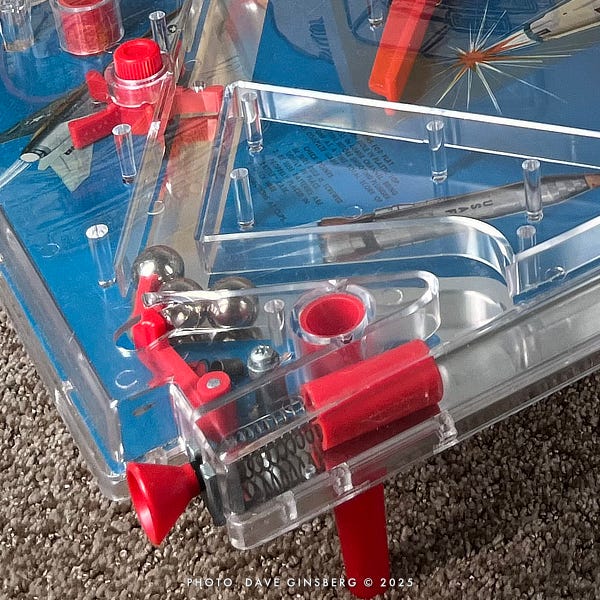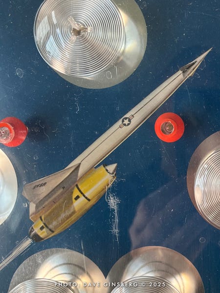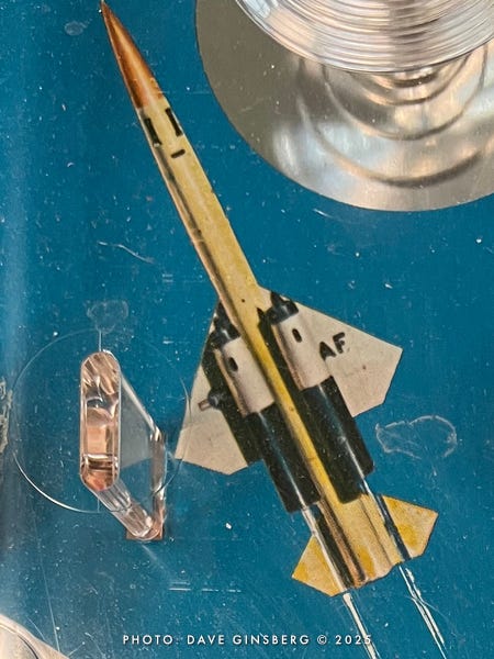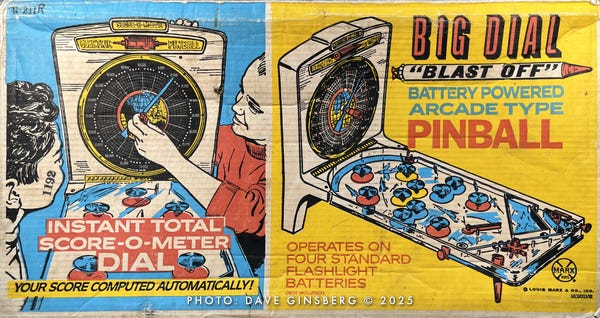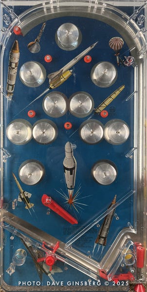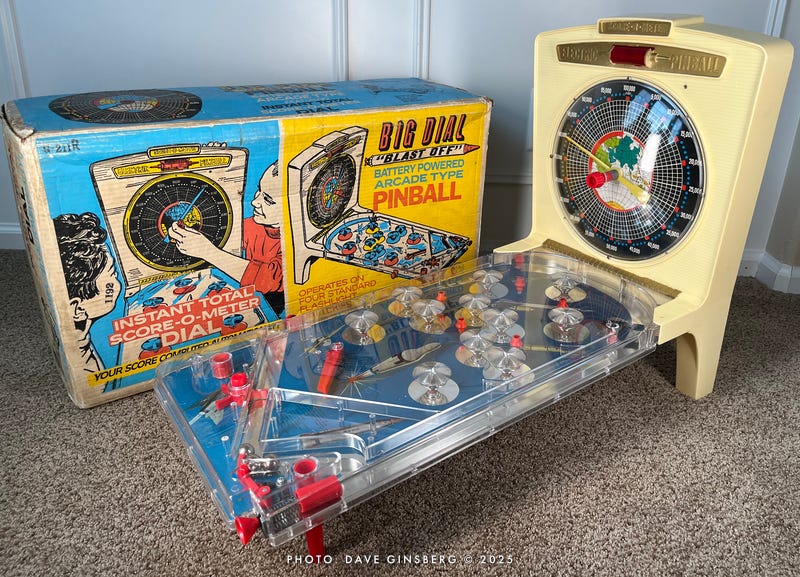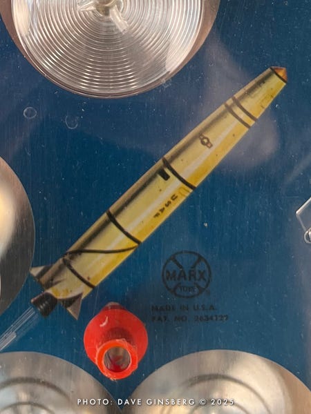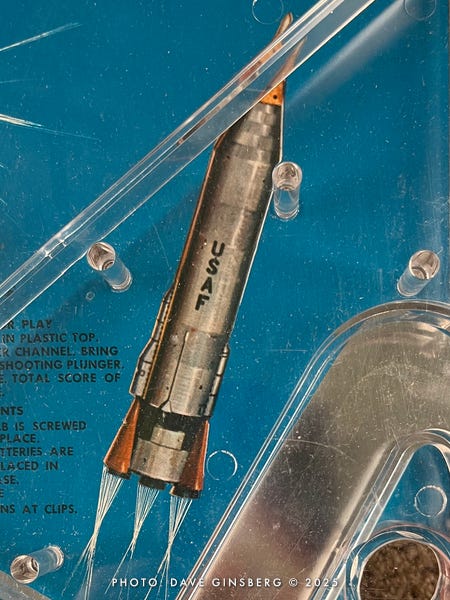 Thus is the case with the Marx Big Dial Blast Off Pinball game. Its theme is set squarely in its time of 1968, and extends into its own past by a decade or so. What was then a showcase of contemporary Cold War missiles, spacecraft and aircraft, now has become an object of historical interest of times gone by.