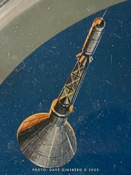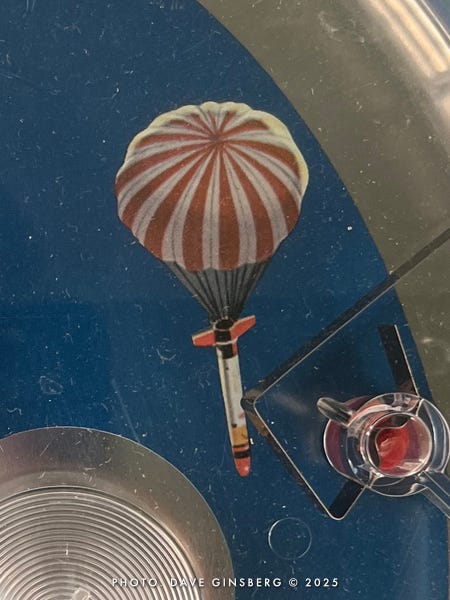 Now, back on the pinball playing field, immediately after impacting the bumper, our Steely-eyed Missile ball reverses course and – given enough speed – arcs back across the top of the board and is stopped from falling back down the launching chute by a thin strip of spring metal. It is here that a recovery parachute is seen with an unidentified rocket suspended beneath it. The identity of this object is a mystery to me, but given the Cold War theme of the game as context, one might guess it could represent an early concept for a film container from a space-borne reconnaissance satellite. If that is the case, it may be likely the illustrator employed some artistic license – perhaps to fill in gaps in knowledge due to a lack of access to possibly sensitive reference material.