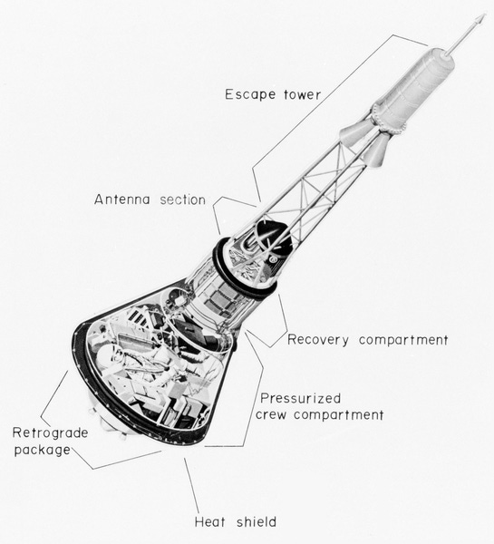 The following cutaway diagram shows the layout of the Mercury capsule and its launch escape tower.