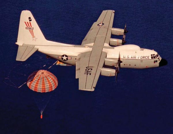 Going with the spy satellite theory, here is an example of how film canisters were recovered in mid-air after deployment from their orbiting host satellites. This particular photograph shows a practice run of a JC-130B catching a simulated film-return capsule.