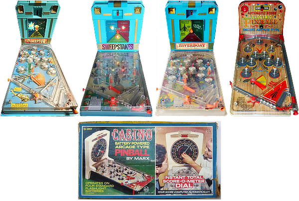 Marx sometimes re-themed their toys to capture a wider variety of interests. On the off chance that you were not a fan of Cold War missiles (not you, of course), Marx had you covered with several theme variations based on similar pinball platforms.