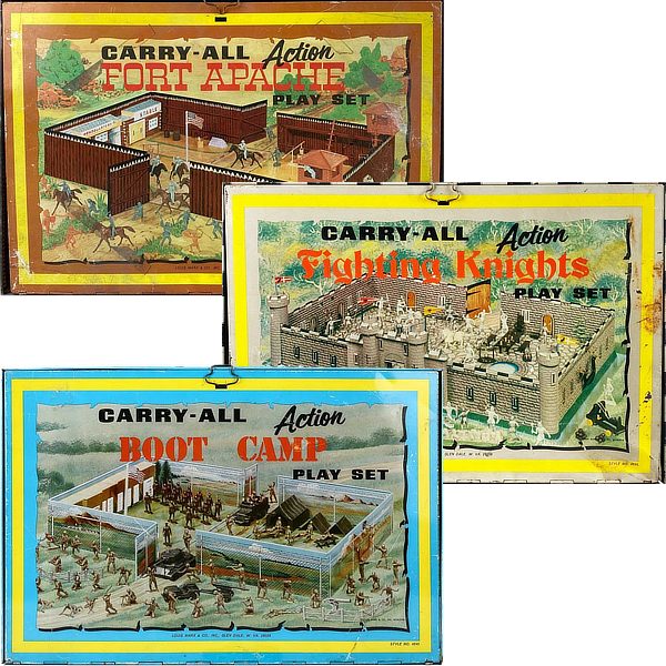 The practice of re-theming toys was not limited to pinball games. Marx used this tactic on their Carry-All line of miniature playsets. As with the pinball games, the common architecture of the Carry-Alls was able to play multiple roles with minor alterations to the design and the included contents.