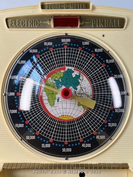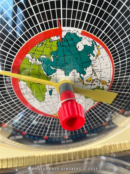 The second-hand-sized needle indicates your ever increasing score as it sweeps clockwise, tracing an orbit around the central globe. Your prime target, identified innocently enough only as “Asia” (but, we know what they really mean) is aligned prominently in your sights. Thank goodness so many of the fathers and mothers of the generation of kids who played this game decided to focus their sights – and missile launches – on the Moon, and not our own fragile planet.