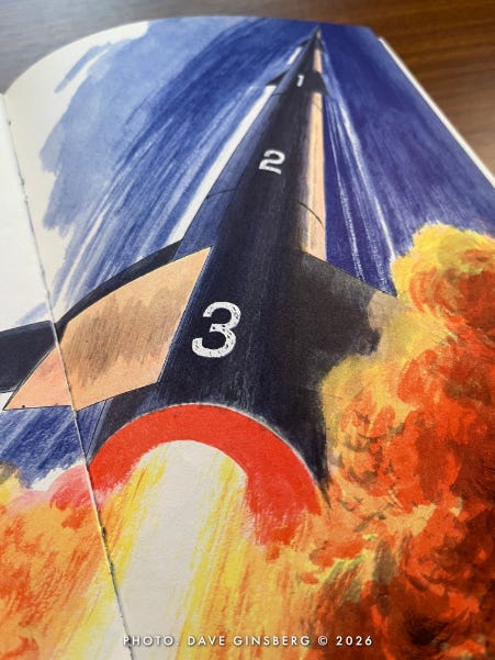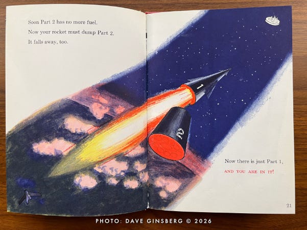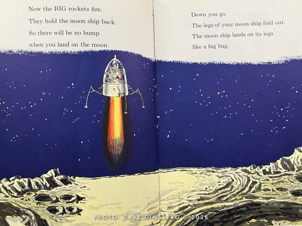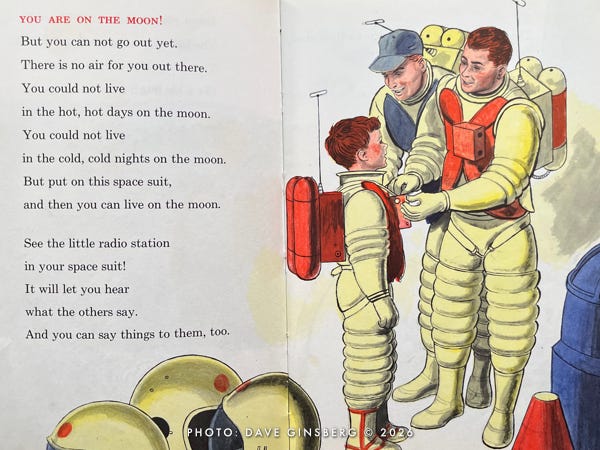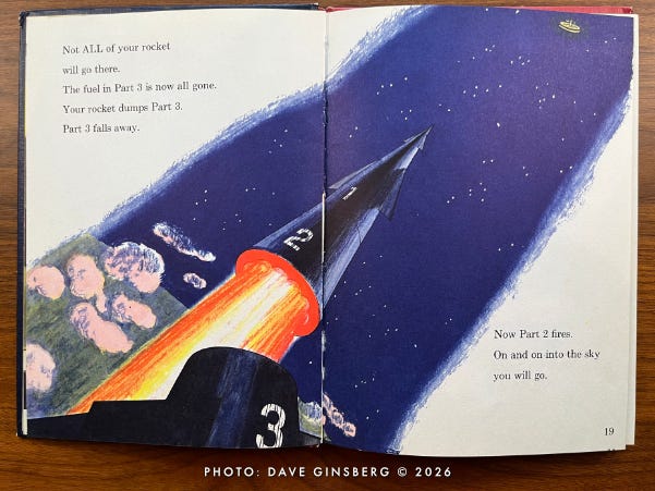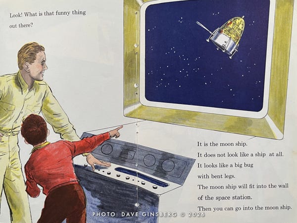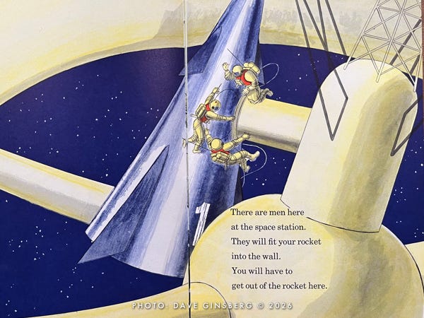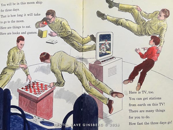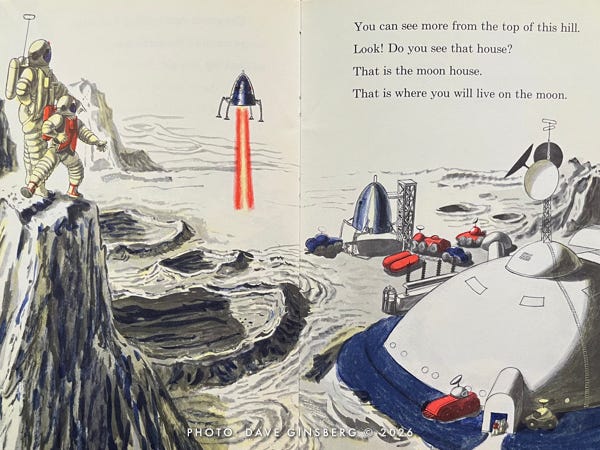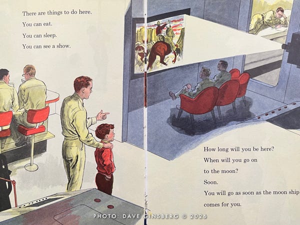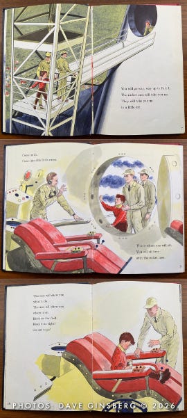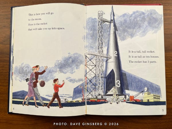 The next thing you know, Little Davey and his parents have left the comfort of their living room and are strutting out to a launch pad where a giant three-stage winged Moon rocket is being readied for its lunar mission. Davey carries a small duffel bag, as if he expects an overnight stay. Mom brought a book, as if she knows this might take a while.
