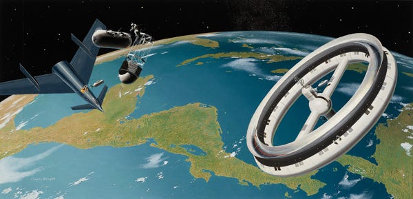 This space station is another design from Wernher von Braun. Here, in another painting by Chesley Bonestell published in 1952 in both Collier’s magazine and Across the Space Frontier, we see the station along with the winged space plane. Astronauts are working adjacent to the space plane, assembling an astronomical observatory, foretelling the Hubble Space Telescope which was sent into orbit in 1990.
