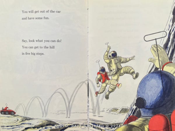 Keeping in mind the book’s publishing date of 1959, it would turn out to be nearly a decade before someone did, indeed, go. Assuming Little Davey is about 10 years old in this illustration, he would be nineteen when Apollo 8 orbited the first crew around the Moon in 1968. By the time NASA’s Apollo lunar missions completed four years later in 1972, Little Davey would likely still have been too young to have earned the necessary qualifications for the astronaut corps. According to NASA’s website, there are no age restrictions for the astronaut program, but it seems that the most successful candidates are equipped with higher degrees as well as applicable life experiences.