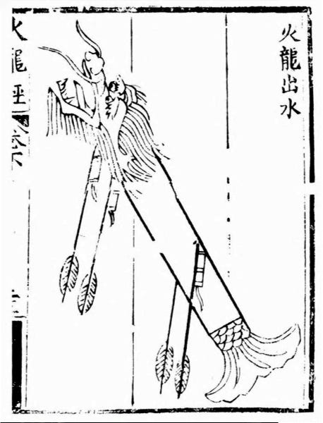 The oldest known multi-stage rocket goes back to 14th century China with the Huo Long Chu Shui, or 'Fire Dragon Out of the Water'.1 It consisted of a hollow bamboo tube with a carved wooden dragon head and tail about 5 ft (1.5 m) long. The front and rear contained four rockets packed with gunpowder that propelled the dragon forwards. Just before the four rockets burned out, fuses would ignite arrow rockets hidden inside the belly of the dragon, which would then shoot out of its mouth propelled by the gunpowder.2