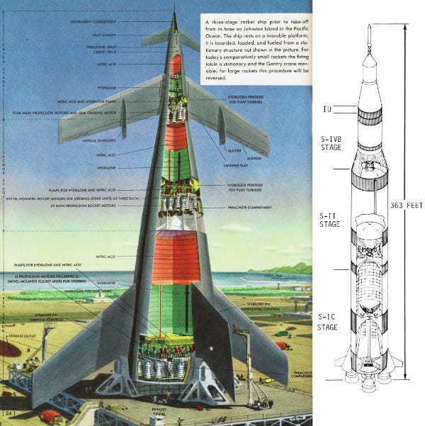 The book’s illustration was clearly inspired by a Wernher von Braun-designed Moonship described in the 1952 book, Across the Space Frontier, written by several spaceflight experts including von Braun, Heinz Haber, and Willy Ley. Also envisioned to be three stages, the rocket’s height was described as being 265-feet (80.8 m) and its weight 7,000 tons (6,350 metric tons). Rolf Klep’s detailed cutaway illustration provides a peek into the inner workings of the mammoth machine.