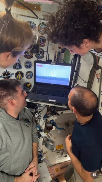 Prerecorded entertainment is not the only type of viewing experience available to current-day astronauts in space. The crewmembers of ISS Expedition 74 watched the live stream of the Artemis II launch on one of the onboard laptop computers on April 1, 2026.