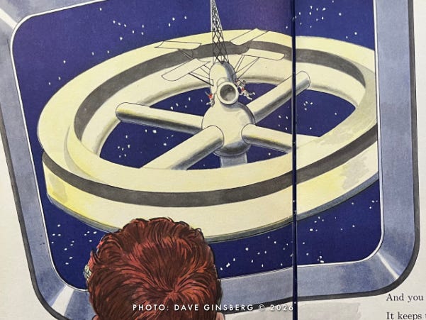 Returning to Little Davey’s adventure, after all of the expended rocket stages are discarded, he notices that there will be a detour on the way to the Moon. A giant wheel-shaped space station looms large in his TV viewscreen. He notices it slowly spinning.