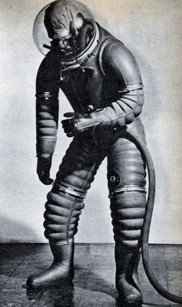These spacesuits seem to derive their inspiration from a prototype pressure suit developed for the U.S Air Force around 1956. I think I’d be ready to get back to those cushy red couches after any length of time inside this tire inner tube.