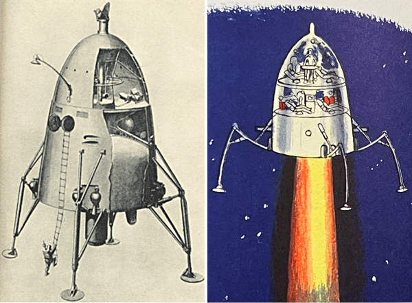 Second, the book’s lander looks to have gained its inspiration from the British Interplanetary Society’s 1938 design for a ‘Lunar Spaceship’. I find it interesting, from an illustration standpoint, that the exterior views of the lander in the book are shown as cutaways, or perhaps with transparent domes. However, the interior views of the spacecraft show no windows at all. My guess is that the artist may have misinterpreted his reference materials.