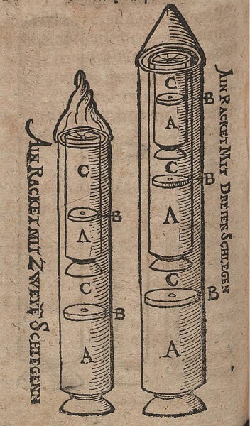 A 16th century German fireworks maker, Johann Schmidlap, is credited for inventing the first “step rocket,” a multi-staged vehicle for lifting fireworks to higher altitudes. A large rocket was ignited and carried one or more smaller rockets. When the large rocket burned out, the smaller rockets ignited sequentially, continuing to higher altitudes before showering the sky with glowing cinders. Schmidlap’s concept, known today as staging, is basic to all modern rocketry.3