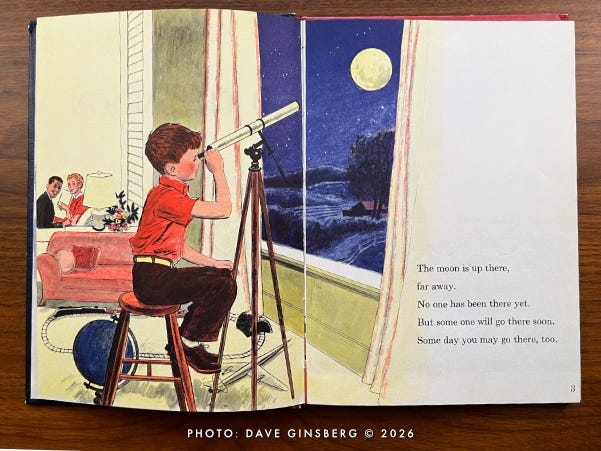 The first two-page illustration spread in the book shows a young boy ... let’s call him “Little Davey” ... peering through a telescope at the full Moon. He sits upon a stool surrounded by a train set, a model airplane, and a world globe. His parents watch from the living room, pleased to see their son’s interest in astronomy being nurtured by their investment.